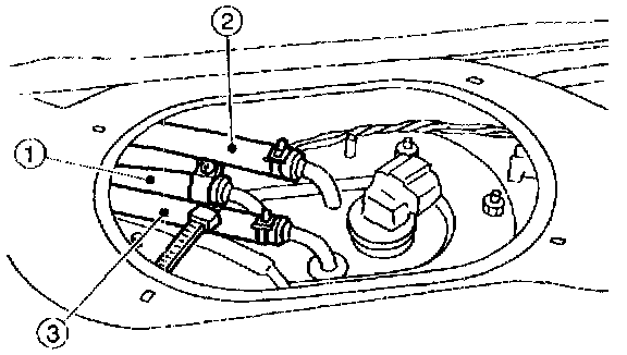 3) Disconnect fuel delivery hose (1), return hose (2) and jet pump hose (3).