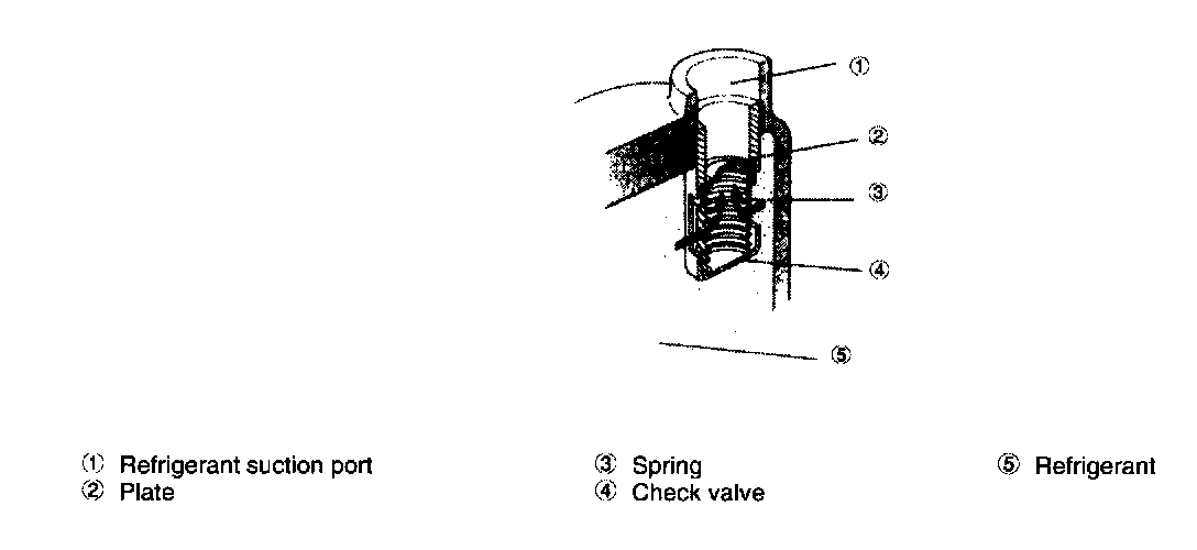 CHECK VALVEA plate and spring are provided on the suction side of the rear head. When there is a large difference between the high and low pressures immediately after the compressor has stopped, reverse rotation of the compressor could cause counter flow to the evaporator, as no suction valve is provided. For this reason, a check valve is provided to prevent counter flow. Immediately after the compressor has stopped, the high pressure refrigerant forces the check valve up to close the suction side piping passage and prevent counter flow from the high to low pressure side.