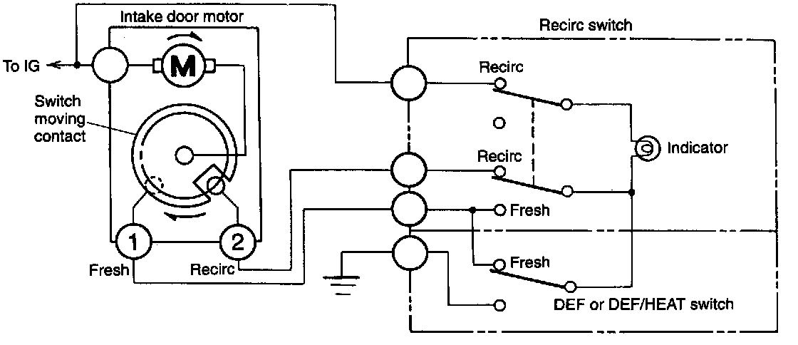 Intake Door ControlIntake door motor is located on the upper part of the intake unit. It opens and closes the intake door with a rod and a link. When the RECIRC switch is set to ON (the RECIRC indicator light), the ground line of the intake door motor is switched to terminal 2 from terminal 1, and the motor starts to rotate because the position switch contacts built into it are set to the current flow position. The contacts turn along with the motor When they reach the non-contact flow position, the motor will stop. The motor always turns in the same direction. When the RECIRC switch is set to OFF (the RECIRC indicator does not light), follow the same operation. When the DEF or DEF/HEAT switch is set to ON (the RECIRC indicator does not light), intake door is open (Fresh position).