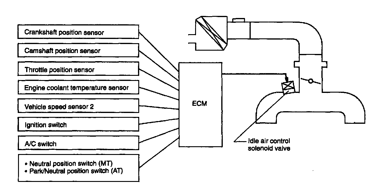IDLE AIR CONTROL- The ECM activates the idle air control solenoid valve in advance to control the amount of by-pass air flowing through the throttle valve in relation to signals emitted from the crankshaft position sensor, camshaft position sensor, engine coolant temperature sensor and A/C switch, so that the proper idle speed specified for each engine load is achieved.