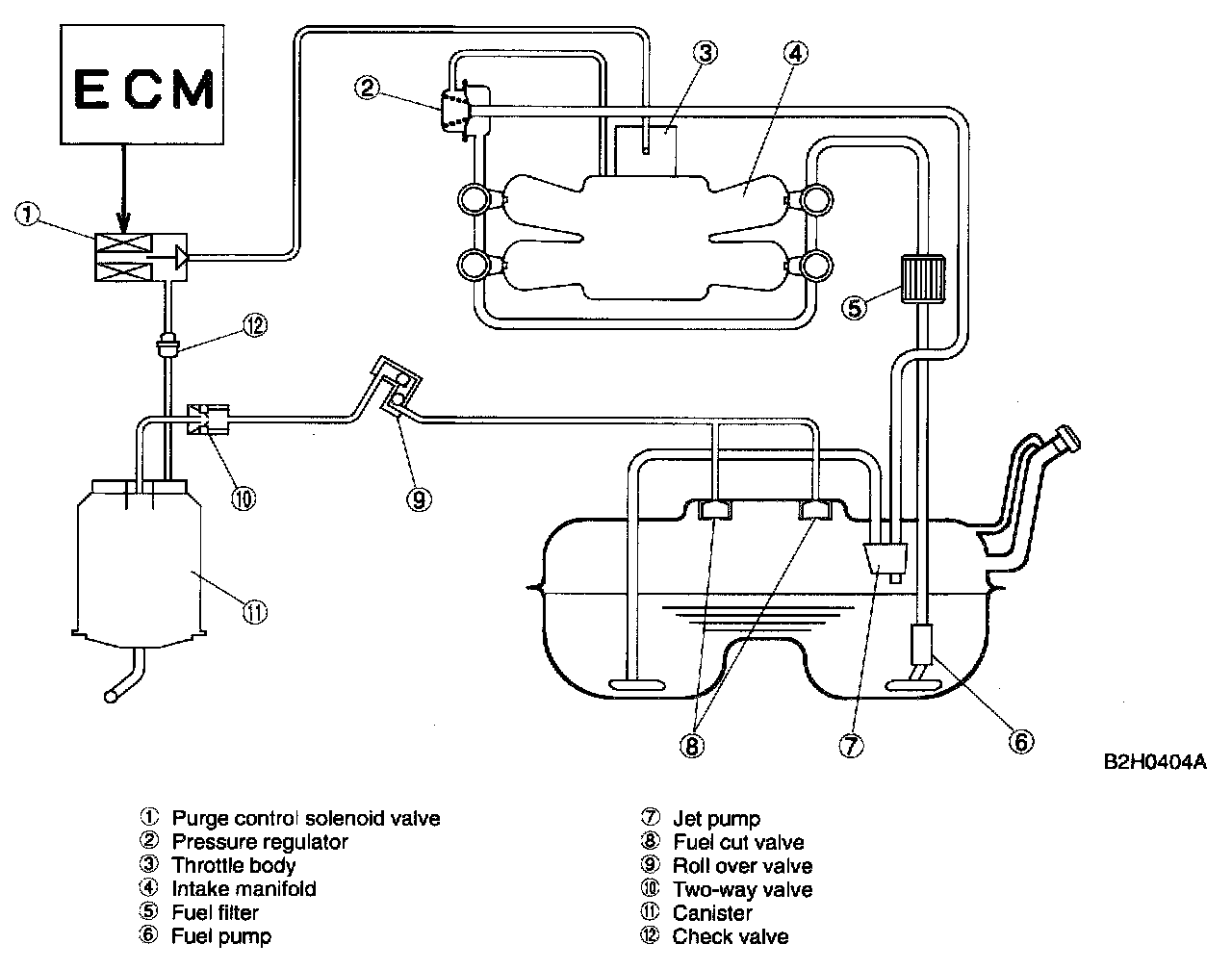GENERAL- Fuel pressurized by the fuel pump built into the fuel tank is delivered to fuel injectors by way of the fuel pipe and fuel filter. Fuel is regulated to the optimum pressure level by the pressure regulator on the way to the injectors.