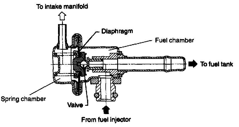 - The pressure regulator is divided into the fuel chamber and the spring chamber by the diaphragm as illustrated below. Fuel is fed to the fuel chamber through the fuel inlet connected with the injector. A difference in pressure between the fuel chamber and the spring chamber connected with the intake manifold causes the diaphragm to be pushed down, and fuel is fed back to the fuel tank through the return line.
