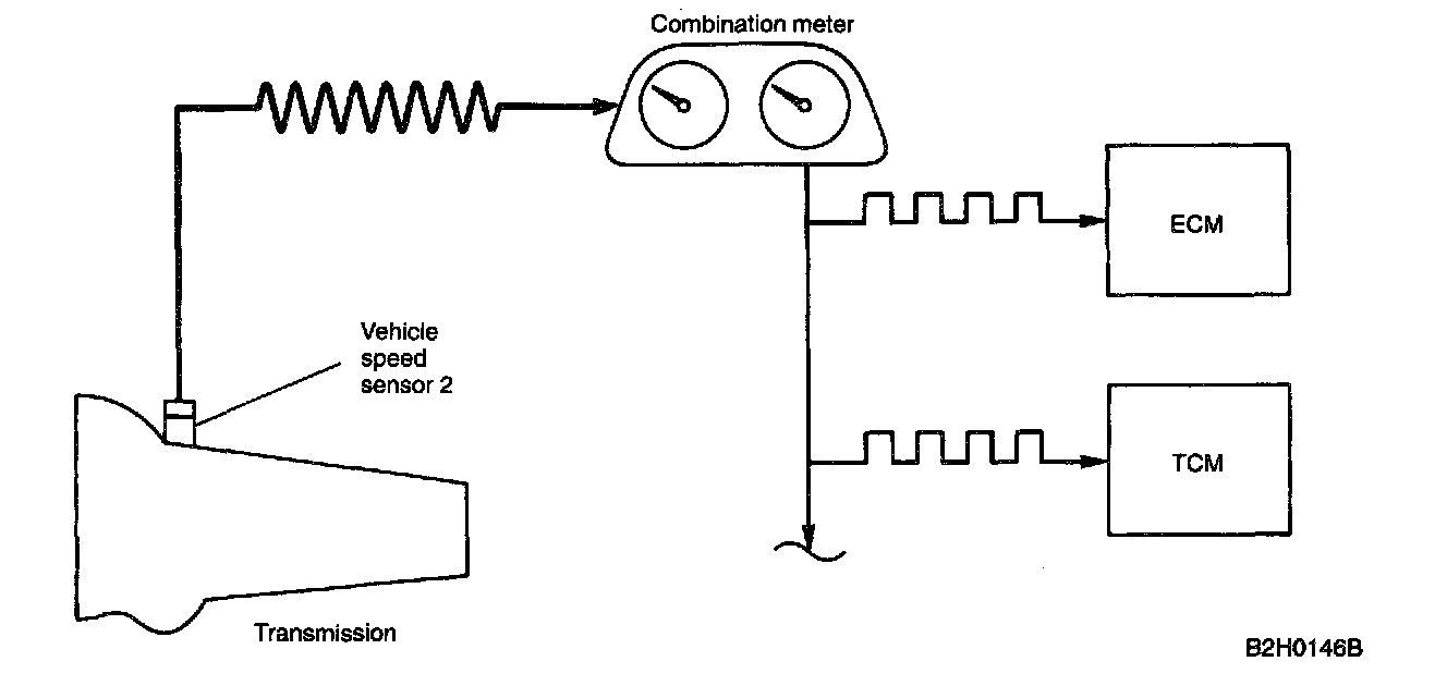 - The vehicle speed sensor 2 generates a 8-pulse signal for every rotation of the front differential and send it to the combination meter. The signal sent to the combination meter is converted there in a 4-pulse signal, and then sent to the ECM of each electronic control system.