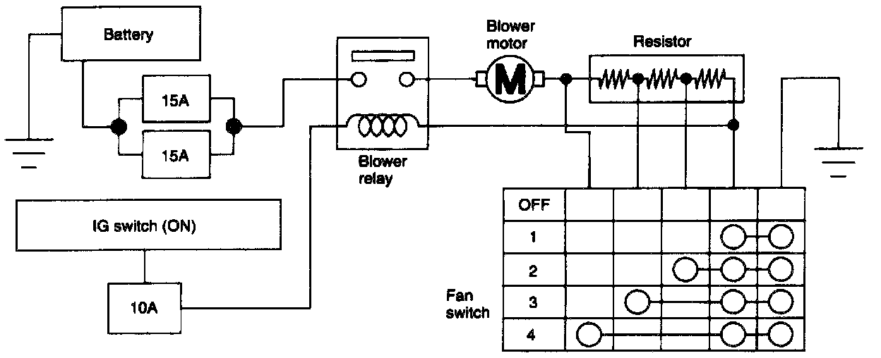 Blower SystemOperation of the blower relay is controlled by turning ON and OFF the ignition switch. When the ignition switch is ON and the fan switch is operated from 1st to 4th speed, electric current from the battery goes through the blower motor, the resistor, the fan switch and ground. The resistor is switched by the position of the fan switch, and controls the blower motor speed from 1st to 4th.
