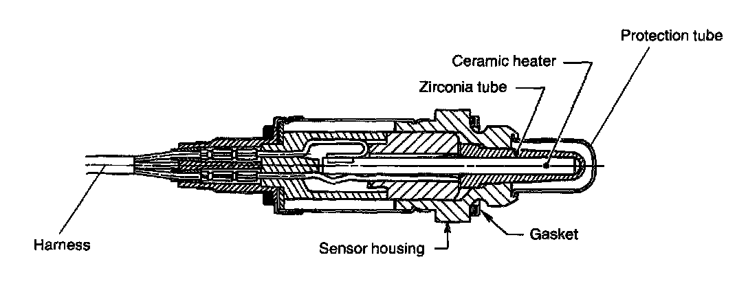 - The oxygen sensor has a zirconia tube (ceramic) which generates voltage if there is a difference in oxygen concentration between the inside and outside of the tube. Platinum is coated on the inside and outside of the zirconia tube for the purpose of catalysis and electrode provision. The sensor housing is grounded to the exhaust pipe, and the inside is connected to the ECM through the harness.