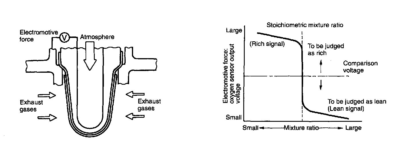 - When a lean air-fuel mixture is burnt in the cylinder, oxygen remains in the exhaust gases even after the catalytic action, and this results in a small difference in the oxygen concentration. The electromotive force is very small.