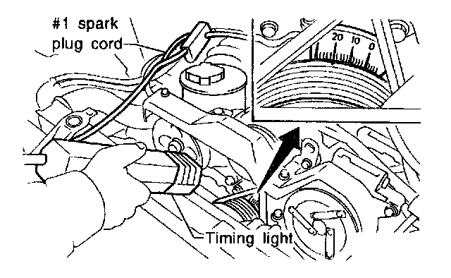 2) To check the ignition timing, connect a timing light to #1 cylinder spark plug cord, and illuminate the timing mark with the timing light