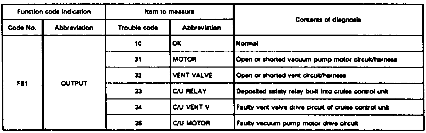 e. Press "O". Example, pressing "O" in Neutral shows "31" Motor (which indicates a faulty motor) on display because power supply to vacuum pump motor is disconnected. When this is shown, set select lever to Drive and turn cruise main switch off. Then repeat test procedure. Refer to Fig. 21, for output system codes and Fig. 22, for select monitor display data.