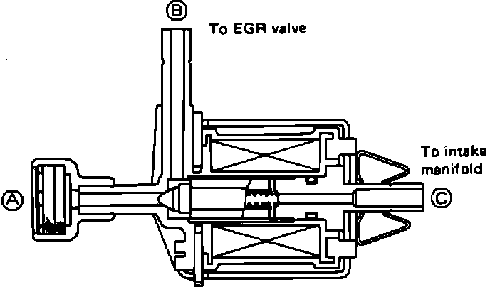 When current is "OFF," spring pressure closes the passage between "A" and "B" and opens the passage between "B" and "C." When current is "ON," the passage between "A" and "B" is opened and the passage between "B" and "C" is closed.