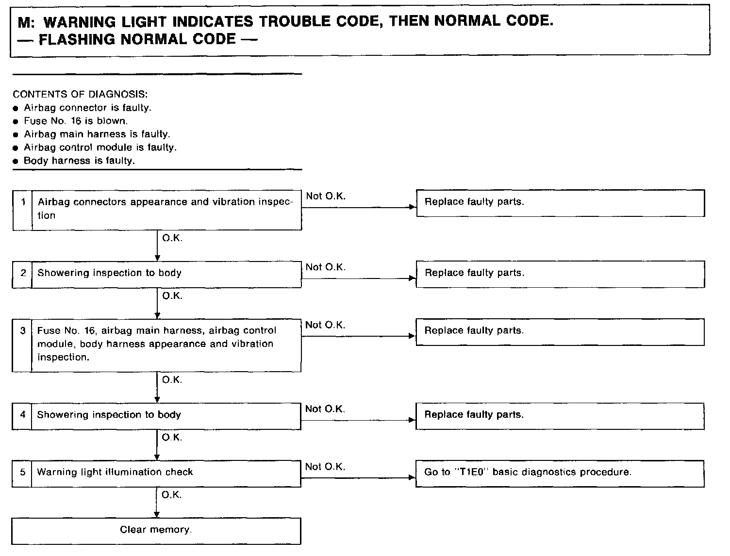 1) Conduct appearance inspection on fuse No.16 airbag main harness airbag control module and body harness. Also check connectors, terminals, wiring harnesses and case for damage.