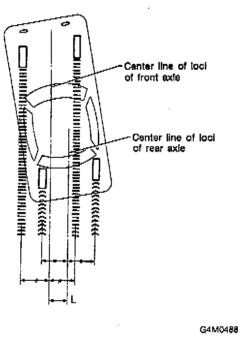 4. Measure distance "L" between center line of loci of the axles. Thrust angle: Less than 20' when "L" is equal to or less than 15 mm (0.59 inch).