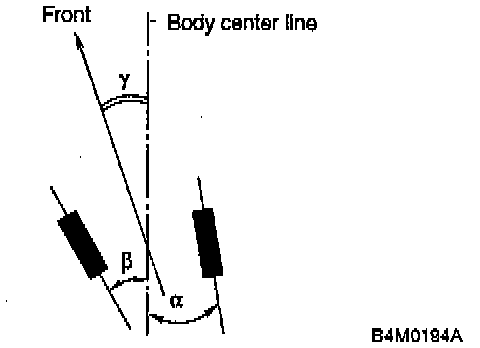 NOTE: Thrust angle refers to a mean value of left and right rear wheel toe angles in relation to vehicle body center line. Vehicle is driven straight in the thrust angle direction while swinging in the oblique direction depending on the degree of the mean thrust angle. Here, use only positive toe-in values from each wheel to substitute for a and b in the equation.
