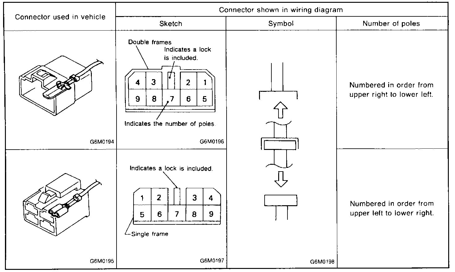 2 The number of poles or pins, presence of a lock, and pin number of each terminal are indicated in the sketch of each connector.