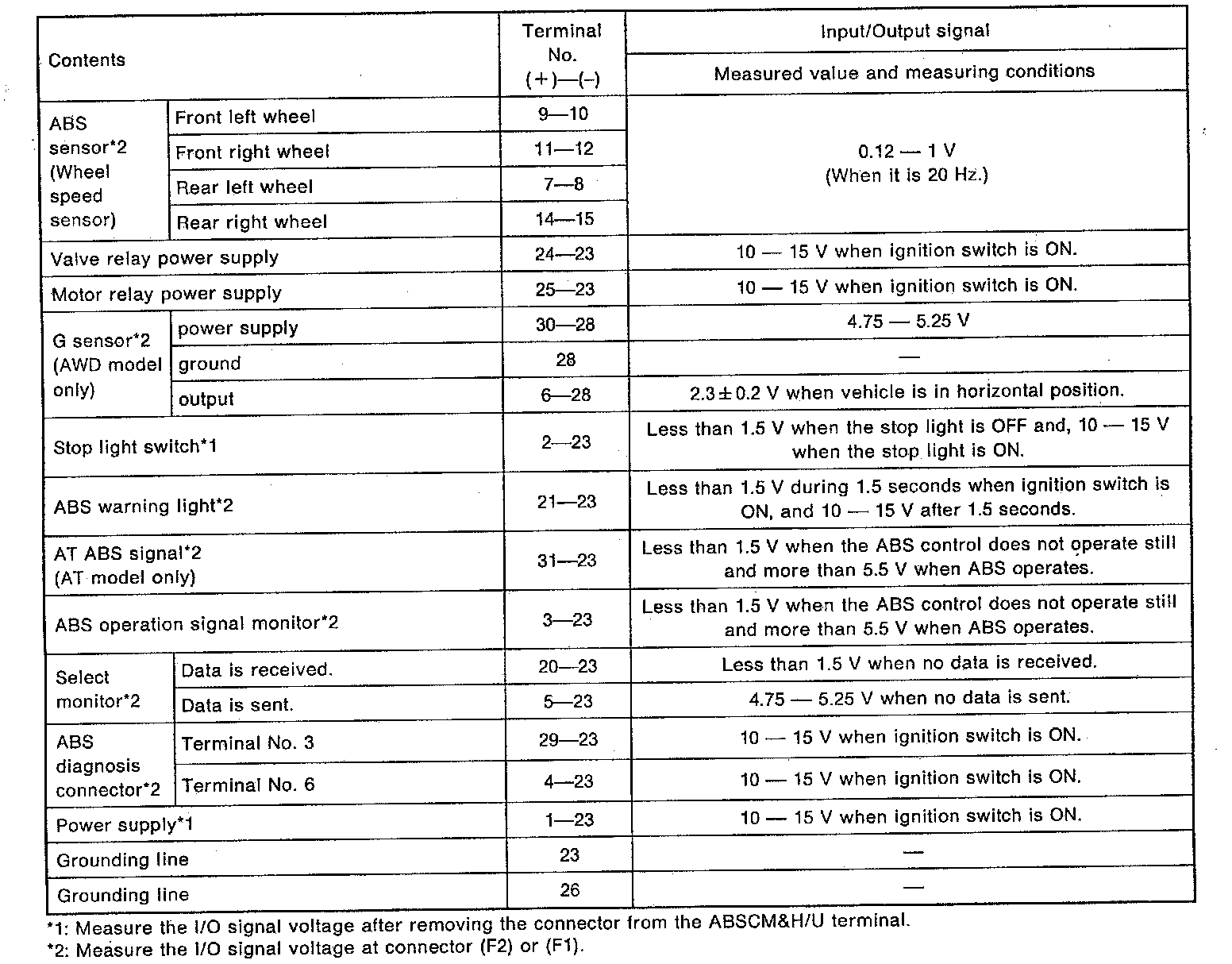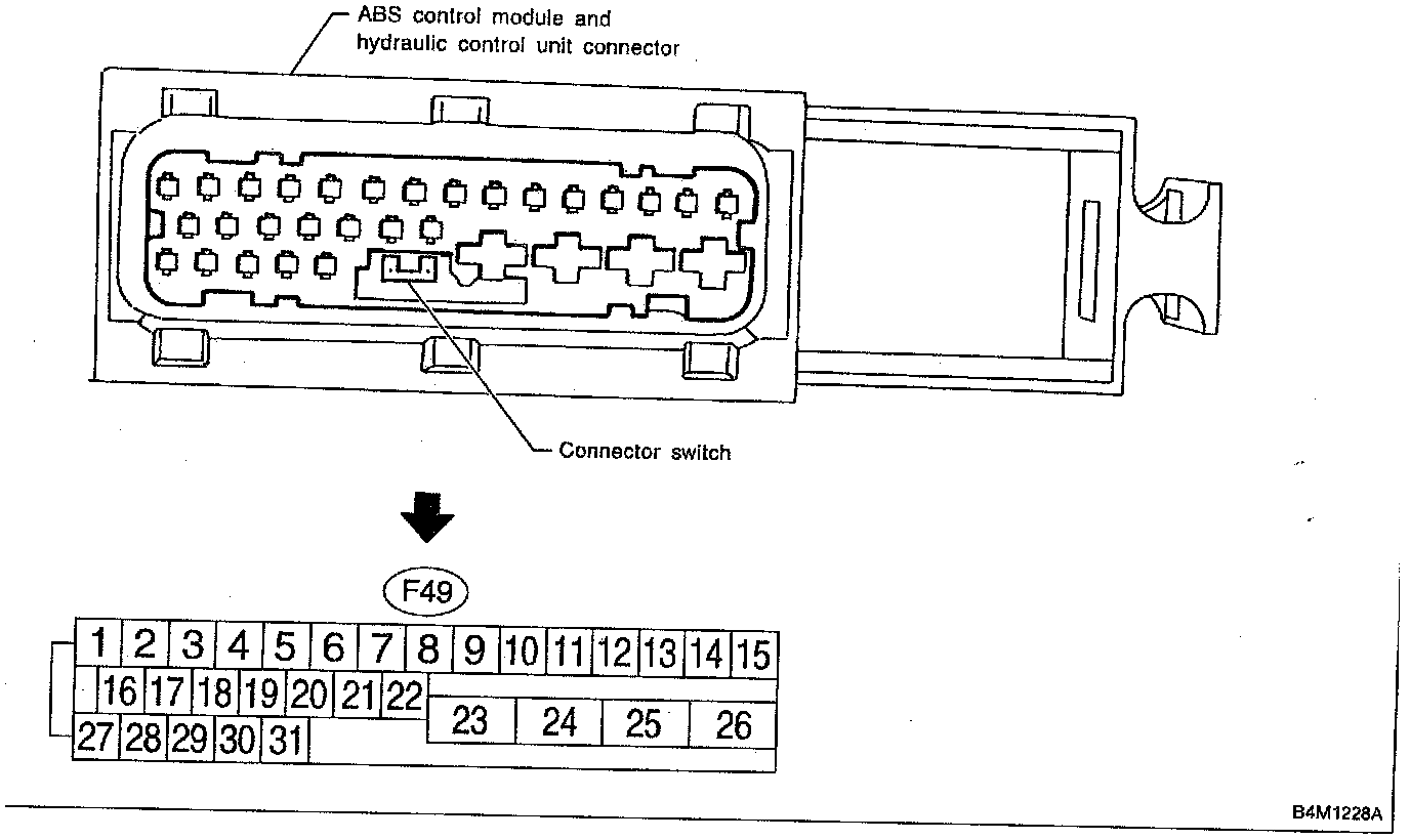 ^ When the connector is removed from the ABSCM&H/U, the connector switch closes the circuit between terminal No. 21 and No. 23. The ABS warning light illuminates.