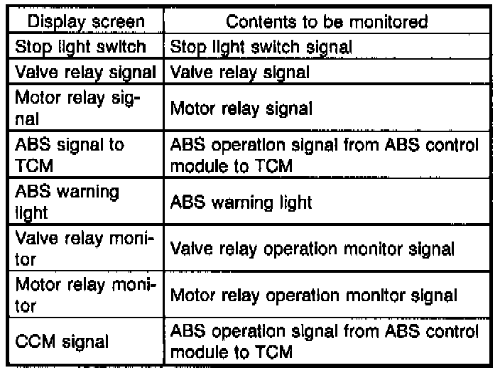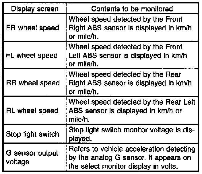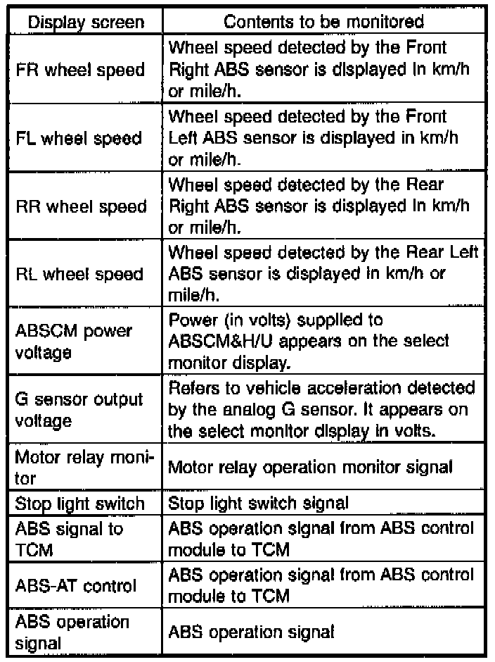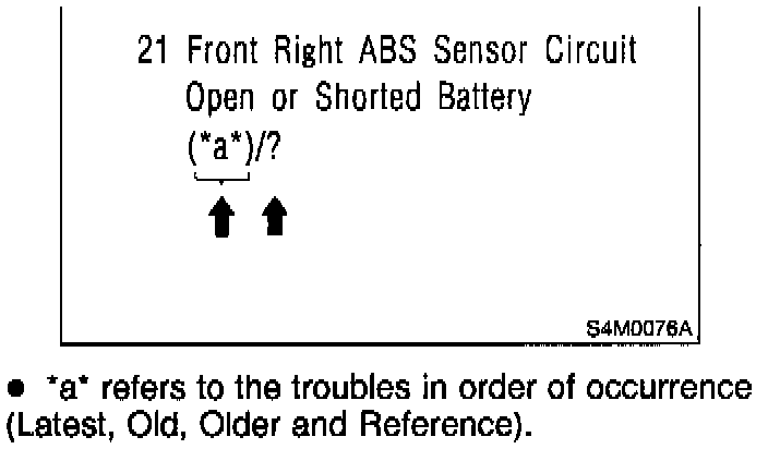 - If a particular trouble code is not properly stored in memory (due to a drop in ABSCM&H/U power supply, etc.) when a problem occurs, the trouble code, followed by a question mark "?", appears on the select monitor display. This shows it may be an unreliable reading.