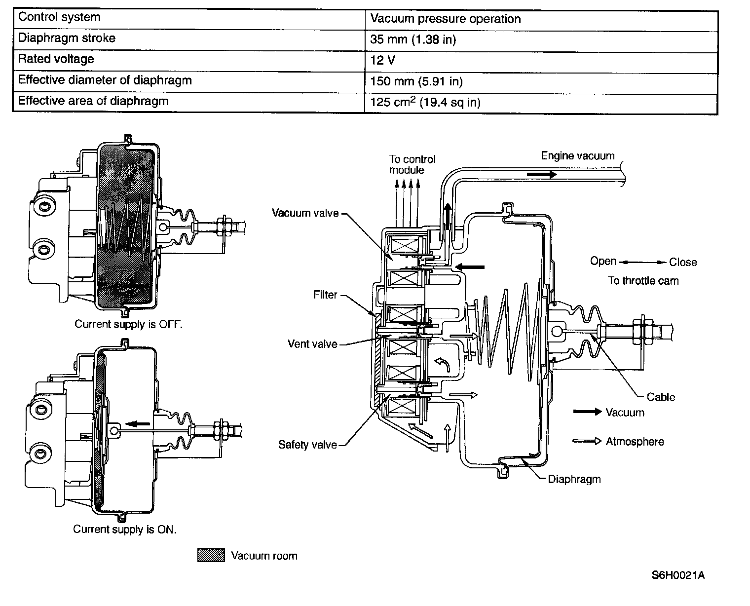 The diaphragm of actuator is operated by vacuum or atmospheric pressure applied through vacuum valve or vent valve, and this diaphragm movement actuates the cruise control cable via link to open or close the throttle valve. With the cruise control set to OFF (system OFF state), no diaphragm operation occurs as the atmospheric, pressure governs inside the actuator.