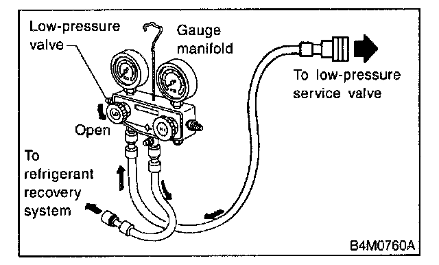 3. Open low-pressure manifold gauge valve slightly, and slowly discharge refrigerant from system.