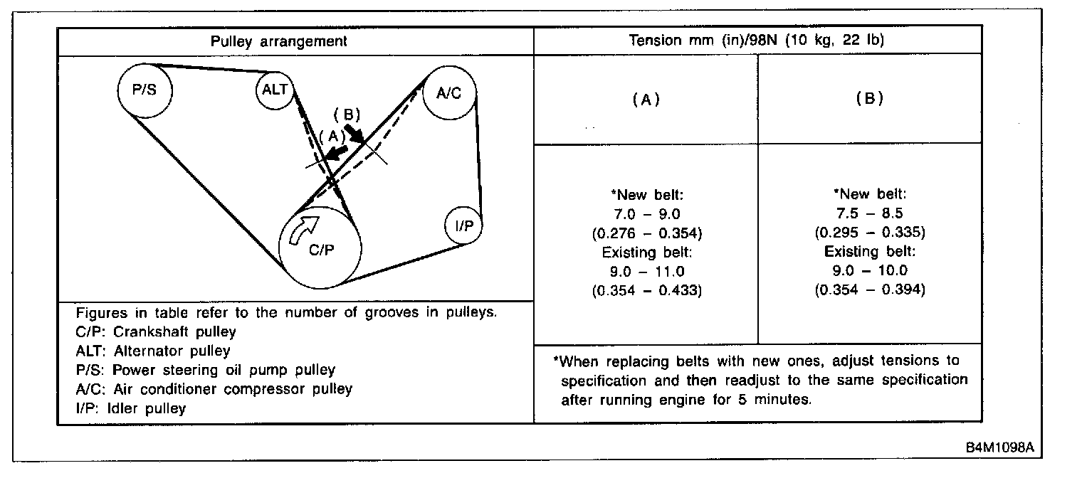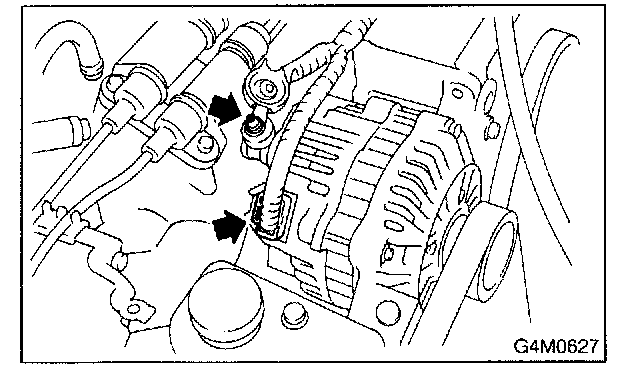 6. Check drive belt tension and adjust it if necessary by changing alternator position and/or idler pulley position.