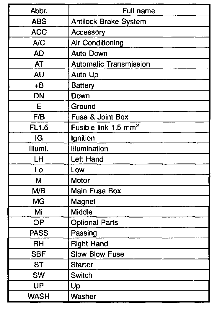 A number of symbols and abbreviations are used in each wiring diagram to easily identify parts or circuits.