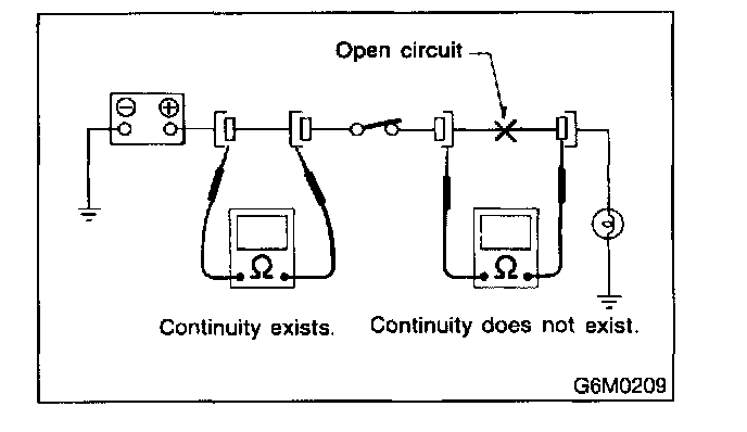 Disconnect all connectors affected, and check continuity in the wiring between adjacent connectors. When the ohmmeter indicates "infinite", the wiring is open.