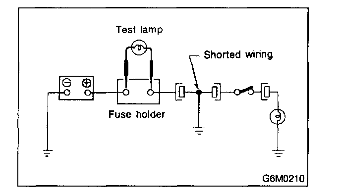 Connect a test lamp (rated at approximately 3 watts) in place of the blown fuse and allow current to flow through the circuit. Disconnect one connector at a time from the circuit, starting with the one located farthest from the power supply. If the test lamp goes out when a connector is disconnected, the wiring between that connection and the next connector (farther from the power supply) is shorted.