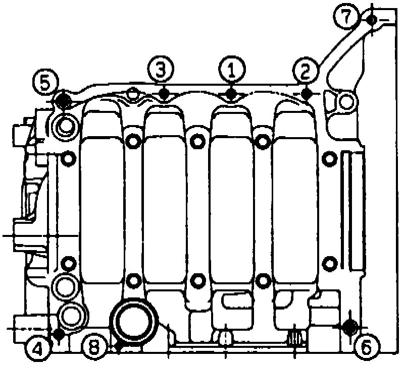 4) Tighten 8 mm and 6 mm cylinder block connecting bolts in numerical order shown in image.
