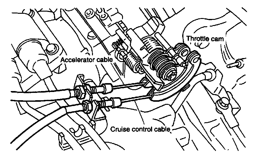 2. Ensure that accelerator cable throttle cam does not move when cruise control throttle cam is moved by hand.