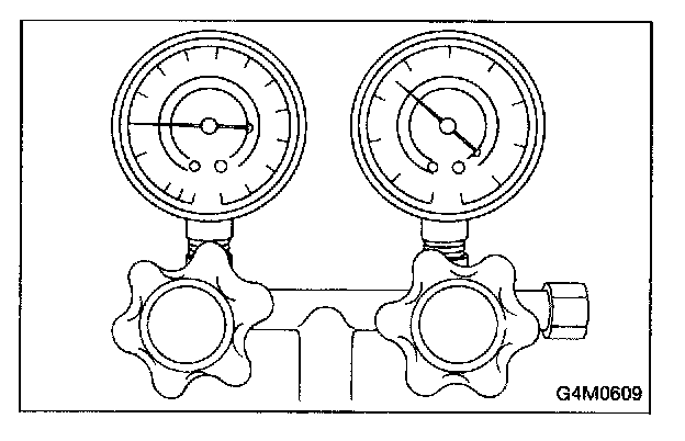 With gauges connected to the A/C system, operate the A/C and confirm that the high side pressure is above 690 kPa (7.03 kg/sq.cm, 100 psi). If not, evacuate and charge the system before leak checking (refer to evacuation and charging).