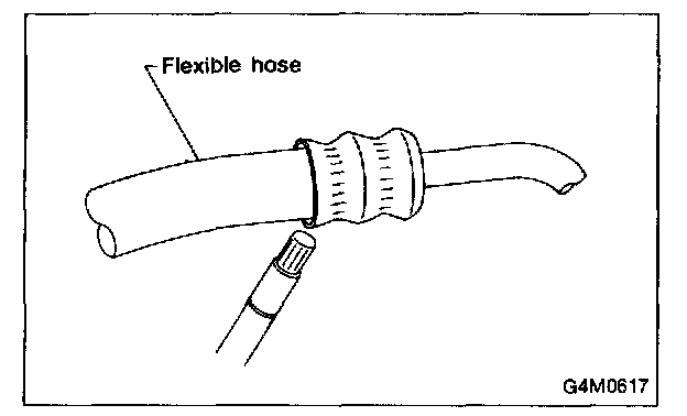 Visually inspect the rubber portions of the flexible hoses for cracking. Probe the rubber section, including the ends of any insulators or protectors which may cover sections of the rubber hose, and near the ends where the rubber meets the metal collar.