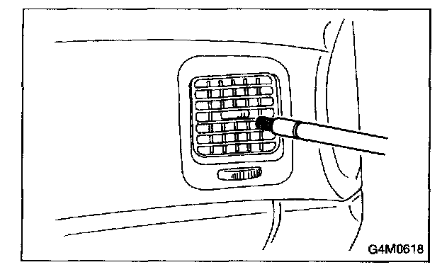 3. With the ignition key in the "ACC" position, run the blower on high speed for 1 minute, then turn the blower off. Place the probe in the center instrument panel vent, an turn the blower on low speed for 1 to 2 seconds, then turn the blower off. Leave the probe in the vent for at least 10 seconds.