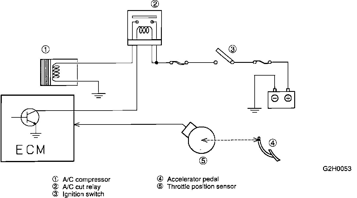 When received by the ECM, the A/C switch signal causes the ECM to make adjustments needed (such as raise idle speed) to compensate for the added load. When the ECM receives a "full open" signal from the throttle position sensor while the A/C is operating, the A/C cut relay turns off the compressor for a certain period. This improves full-throttle acceleration.