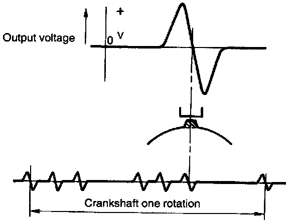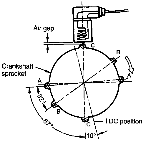 The crankshaft sprocket is provided with six protrusions. Crankshaft rotation causes these protrusions to cross the crankshaft position sensor so that magnetic fluxes in the coil change with the change in air gap between the sensor pickup and the sprocket. The change in air gap induces an electromotive force which is transmitted to the ECM.