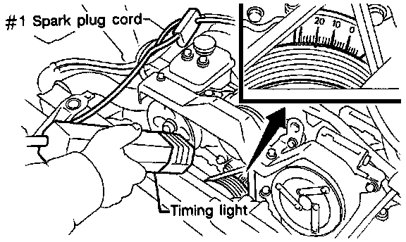 2. To check the ignition timing, connect a timing light to #1 cylinder spark plug cord, and illuminate the timing mark with the timing light.