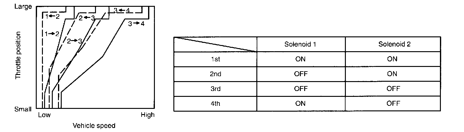 Gearshifting is controlled in response to driving conditions, according to the shift point characteristic data, as shown in the following diagram, stored in the TCM. Solenoids are operated at the proper time corresponding to the shift pattern, throttle position, and vehicle speed for smooth shifting.