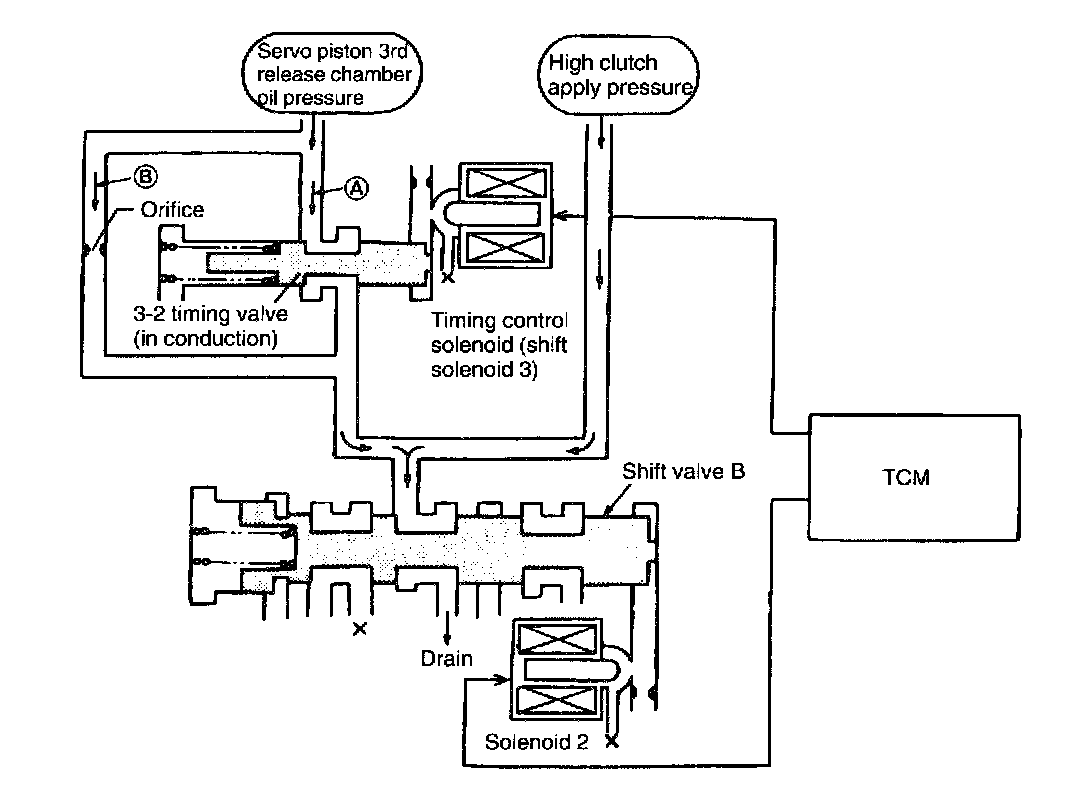 - When the 3-2 timing valve does not conduct, oil pressure applied to the 3rd release chamber is slowly released through passage (B) (provided with an orifice).