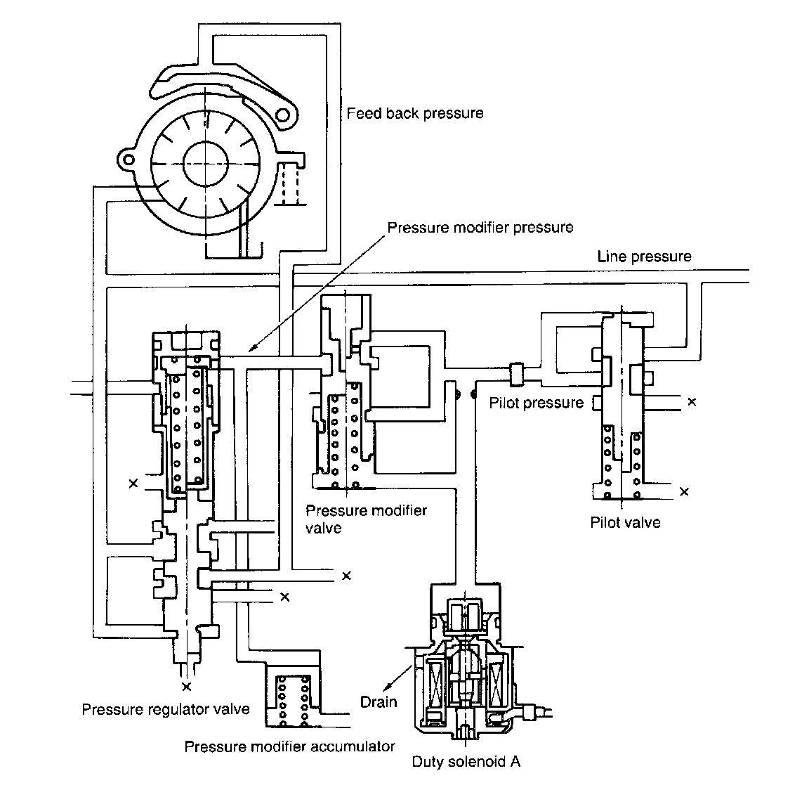 2. The pilot pressure applied to the pressure modifier valve is regulated by the line pressure controlling duty solenoid A and changed into the pressure modifier pressure.