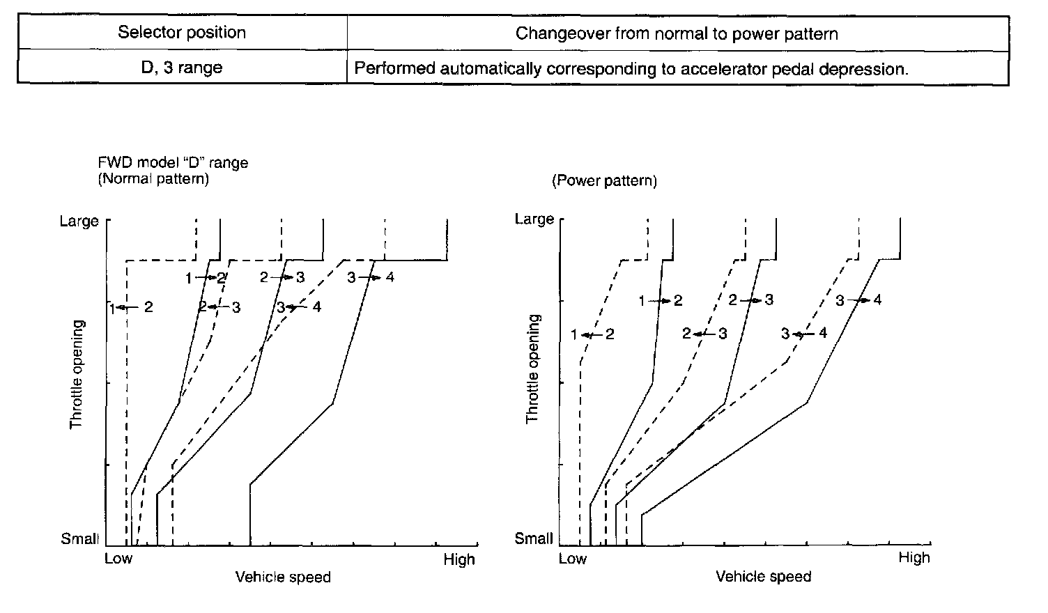 The power pattern is shifted to the normal pattern, depending on car speed. Shifting to the normal pattern is determined by the throttle position as shown in Figure below. Time lag in shifting is also determined by car speed. The maximum time lag is 3 seconds.