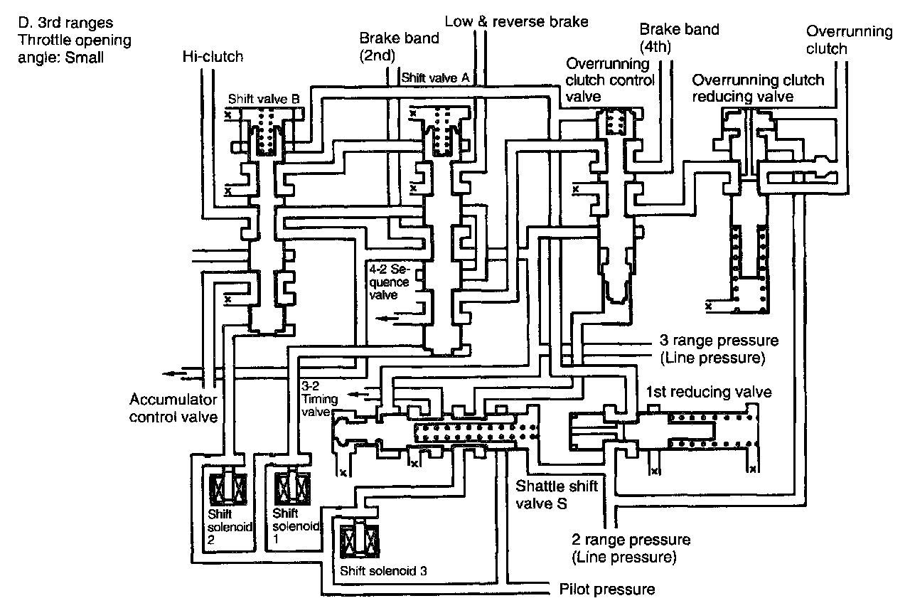 1. In range D or 3, the overrunning clutch is kept inoperative by the action of the shuttle shift valve S when the throttle position is large. With small throttle valve opening, the overrunning clutch is engaged by the action of shift solenoid 3.