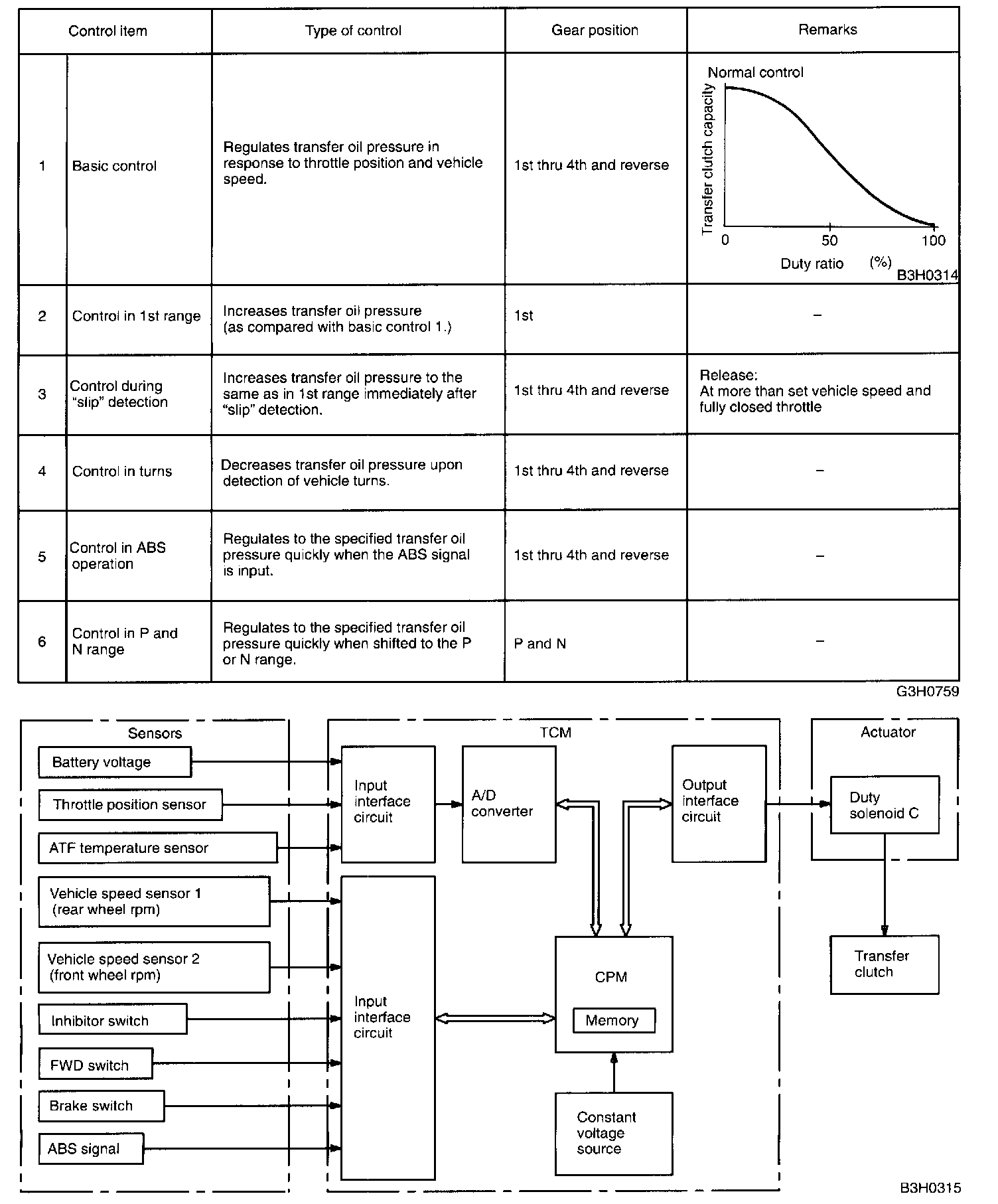 The hydraulic oil pressure (line pressure) is regulated by the transfer pilot valve, duty solenoid C and transfer control valve for obtaining optimum rear torque distribution corresponding to the driving conditions.