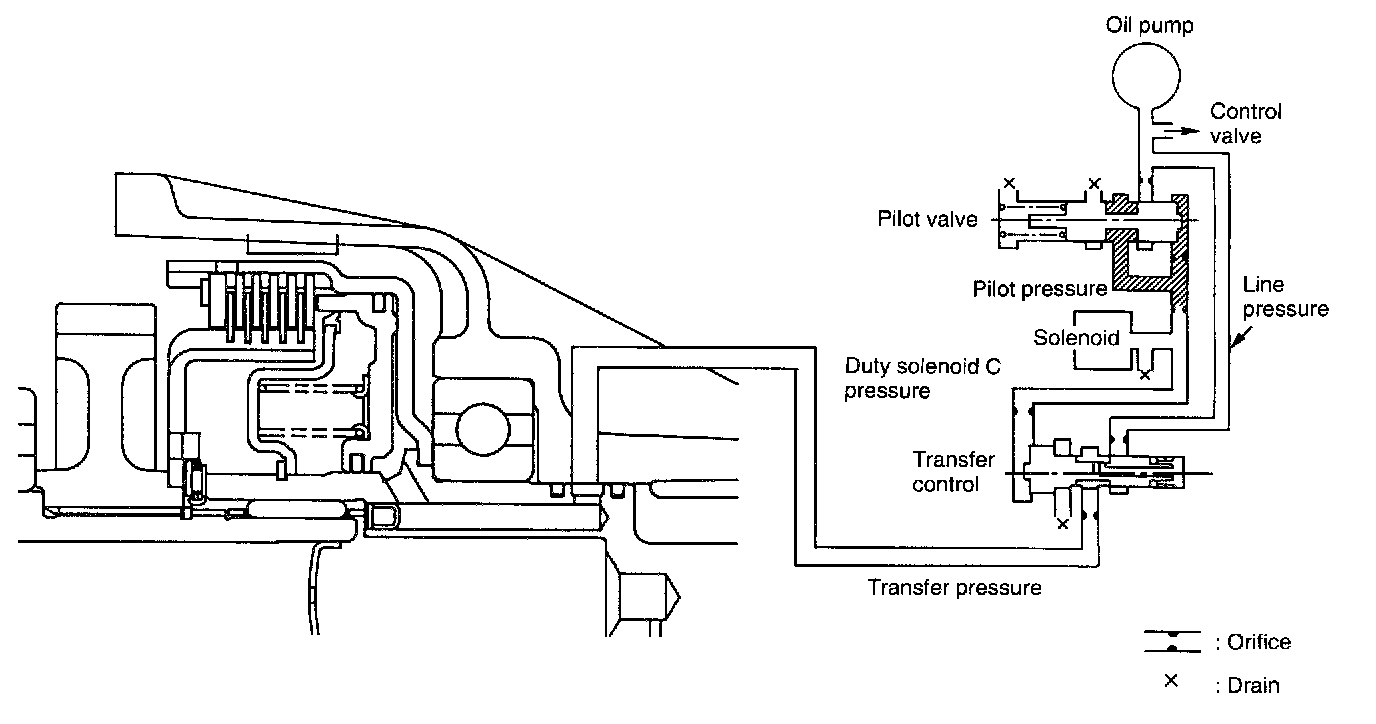 2. The pilot pressure is regulated to the transfer duty pressure by the duty solenoid C whose duty ratio is controlled by the TCM corresponding to the driving condition. (The transfer duty pressure varies with the degree of duty control.)