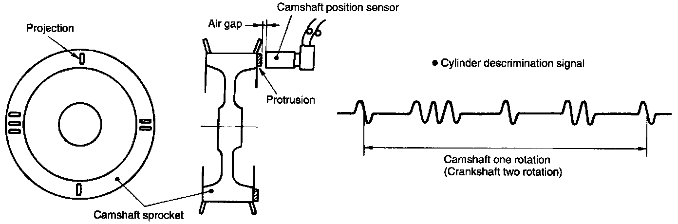 It is designed so that the Engine Control Module (ECM) accurately reads the number of pulses which occur when protrusions provided on the back of the left hand camshaft-drive sprocket cross the sensor. Internal construction and the basic operating principle of the camshaft position sensor are similar to those of the crankshaft position sensor. A total of seven protrusions (one each at two locations, two at one location and three at one location) are arranged in four equal parts of the sprocket, as shown.
