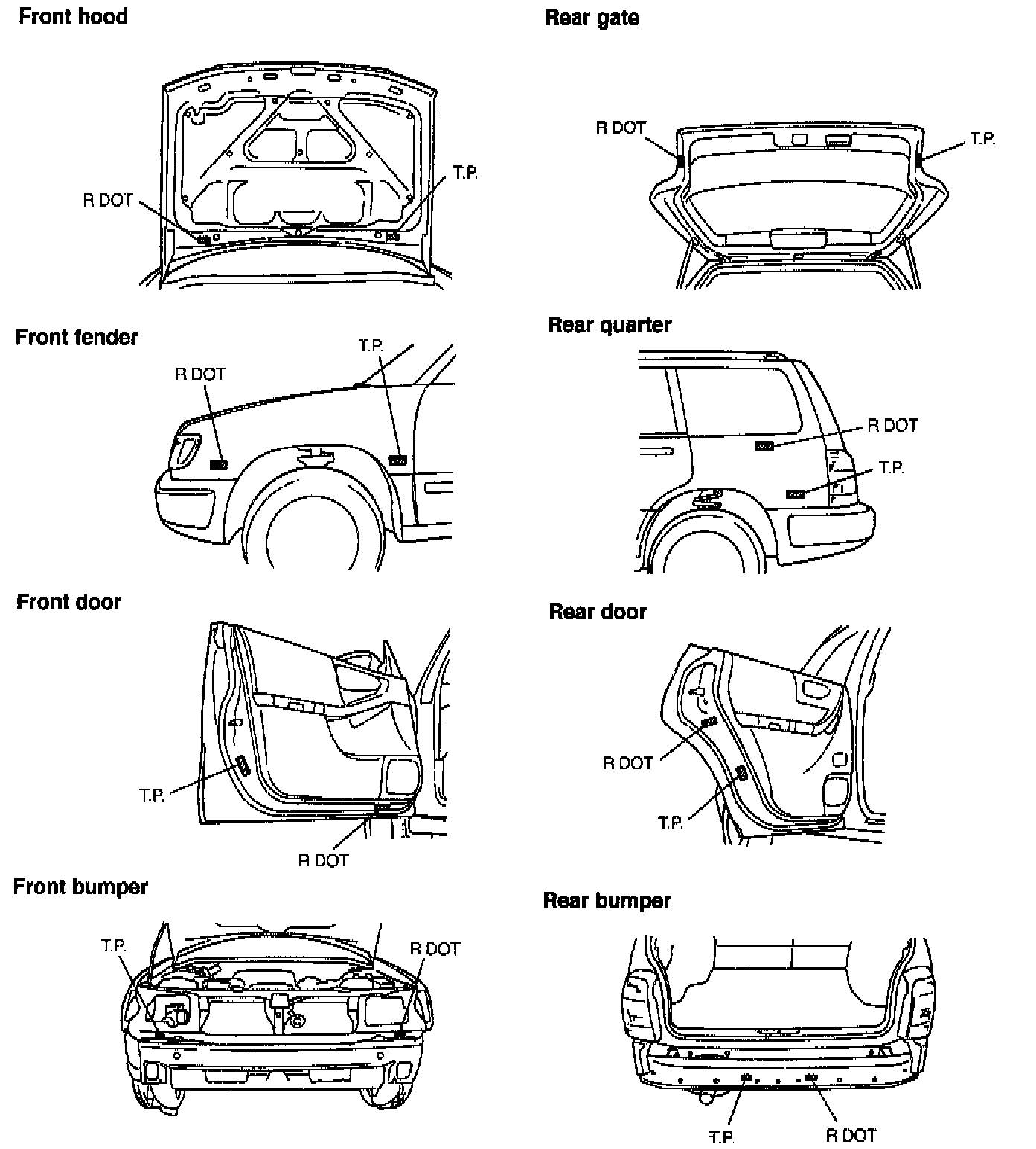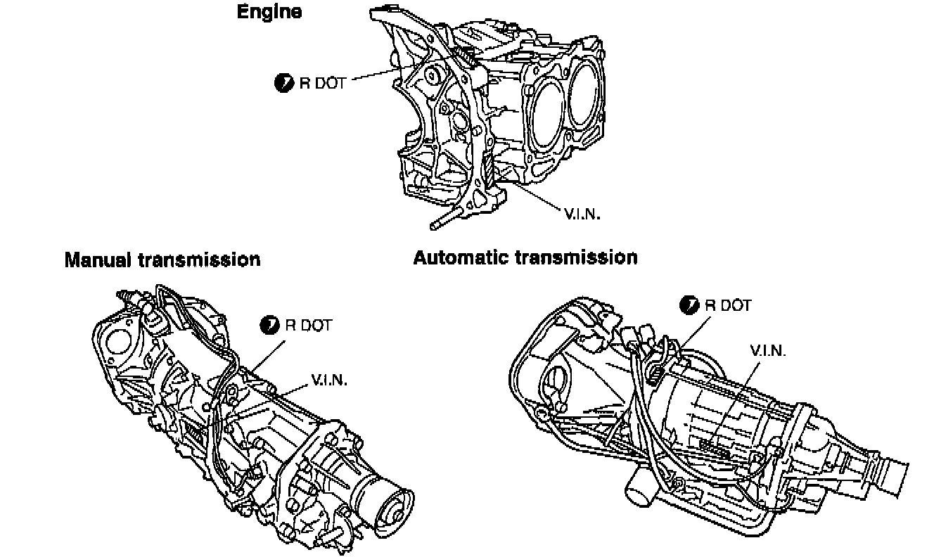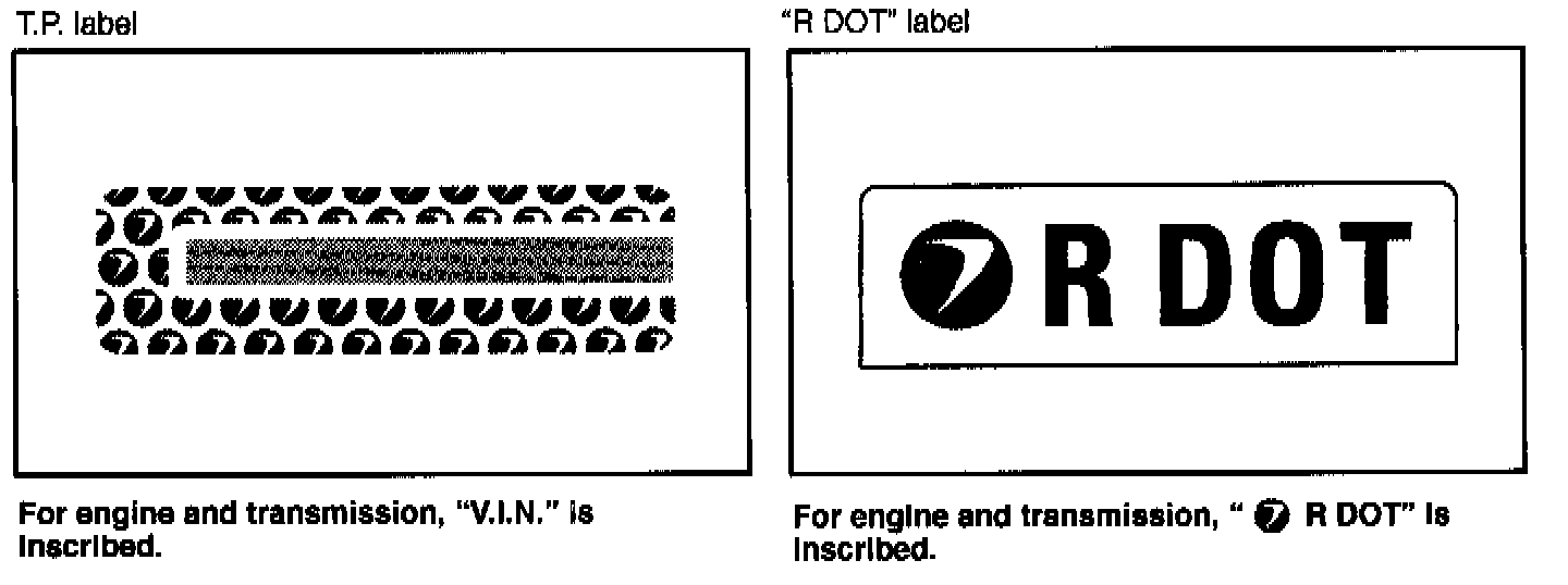 The Theft Prevention (IP) label is stuck or V.I.N. is inscribed on the main line installed parts shown below. Additionally, the "H DOT" label is stuck or "R DOT" is inscribed on the main spare parts shown.A: T.R LABEL AND "R DOT" LABEL