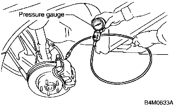 2. When using the pressure gauge, depress brake pedal so as to make the pressure gauge indicate 3,432 kPa (35 kg/cm2 , 498 psi).