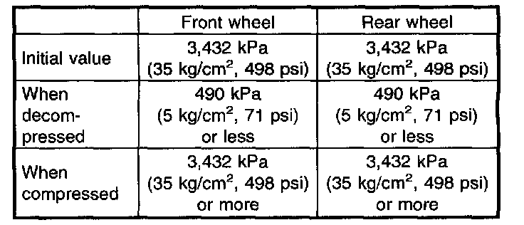 7. Read values indicated on the pressure gauge and check if the fluctuation of the values between decompression and compression meets the standard values. Also check if any irregular brake pedal tightness is felt.