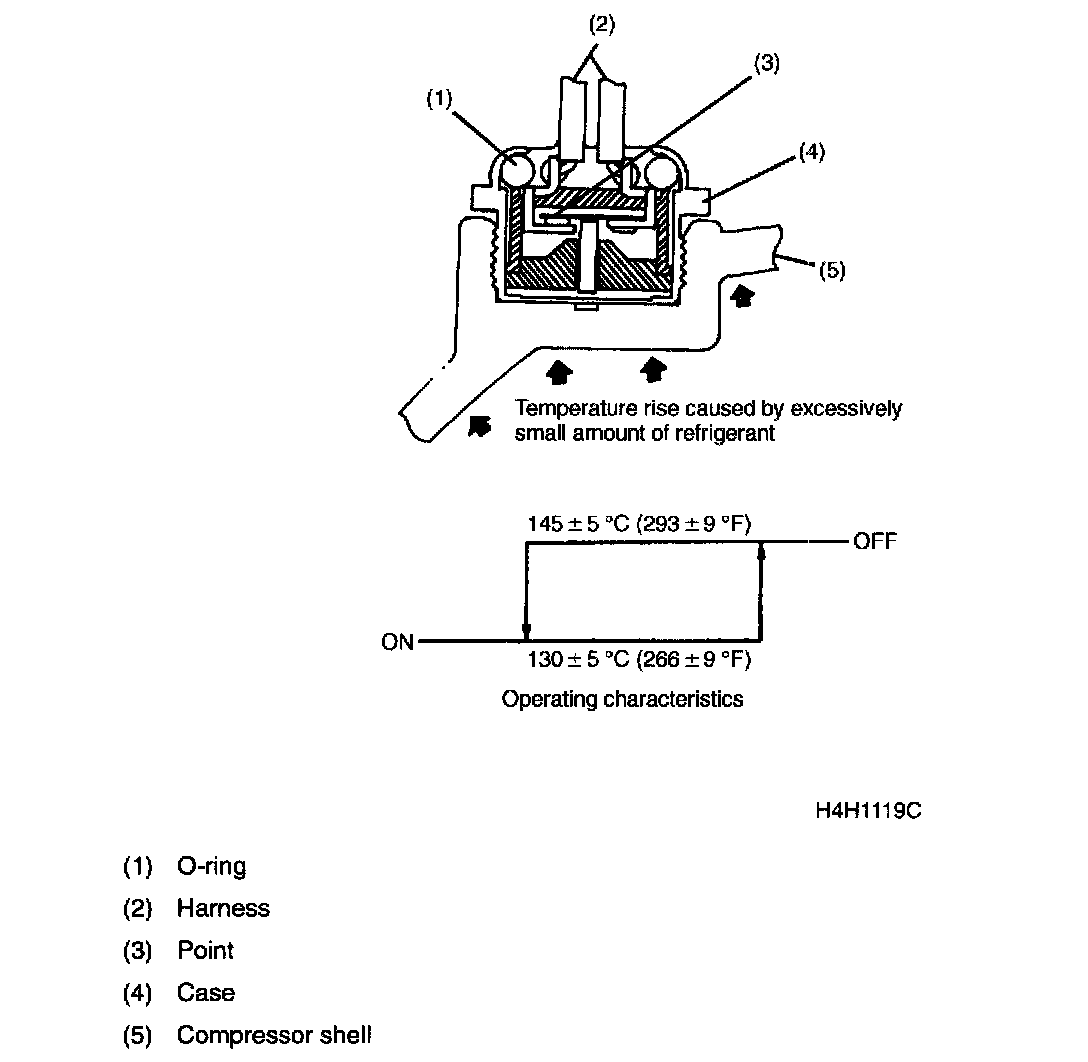 Compressor Saving SensorThe compressor saving sensor, mounted on the surface of the compressor case, forces the compressor to the OFF state when the gas temperature rises or the case surface temperature becomes abnormally high due to poor lubrication.