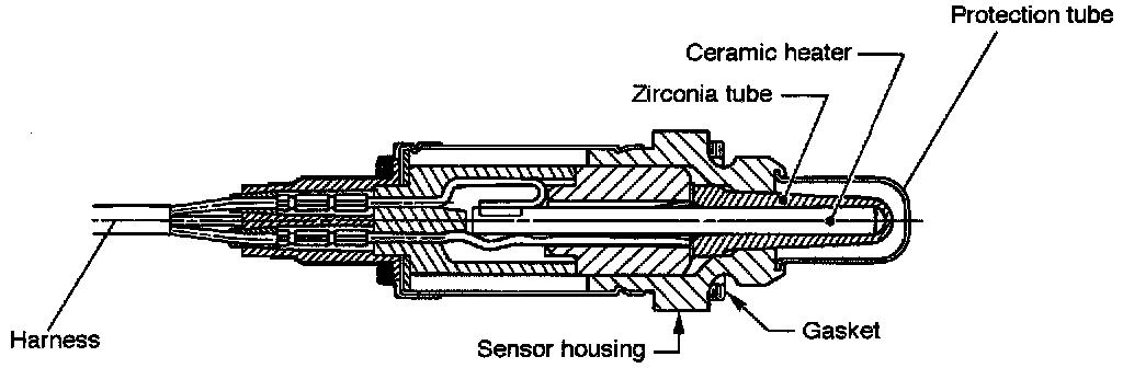- The oxygen sensor has a zirconia tube (ceramic) which generates voltage if there is a difference in oxygen concentration between the inside and outside of the tube. Platinum is coated on the inside and outside of the zirconia tube for the purpose of catalysis and electrode provision. The sensor housing is grounded to the exhaust pipe, and the inside is connected to the ECM through the harness.