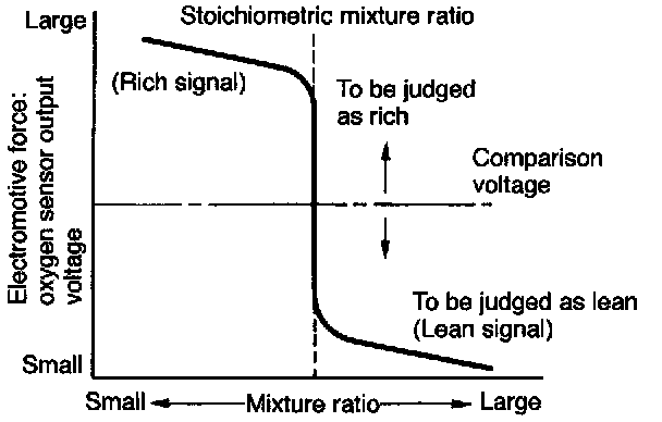 - The difference in oxygen concentration changes greatly in the vicinity of the optimum air-fuel ratio, and hence the change in the electromotive force is also large. By inputting this information into the ECM, the air-fuel ratio of the supplied mixture can be determined easily. The oxygen sensor does not generate much electromotive force when the temperature is low. The characteristics of the electromotive force stabilize at temperature of approximately 300 to 400°C (572 to 752°F).