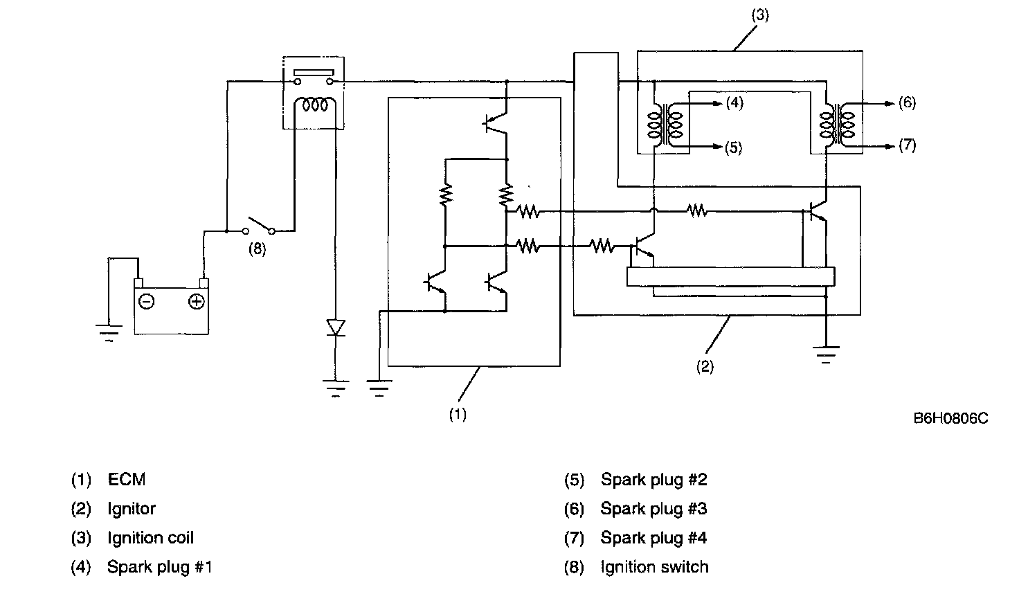 The ignition system is of a 2-cylinder simultaneous ignition design. In response to the signal from the ECM, the ignitor supplies another signal to the ignition coil to ignite a pair of cylinders #1 and #2 or #3 and #4 simultaneously.