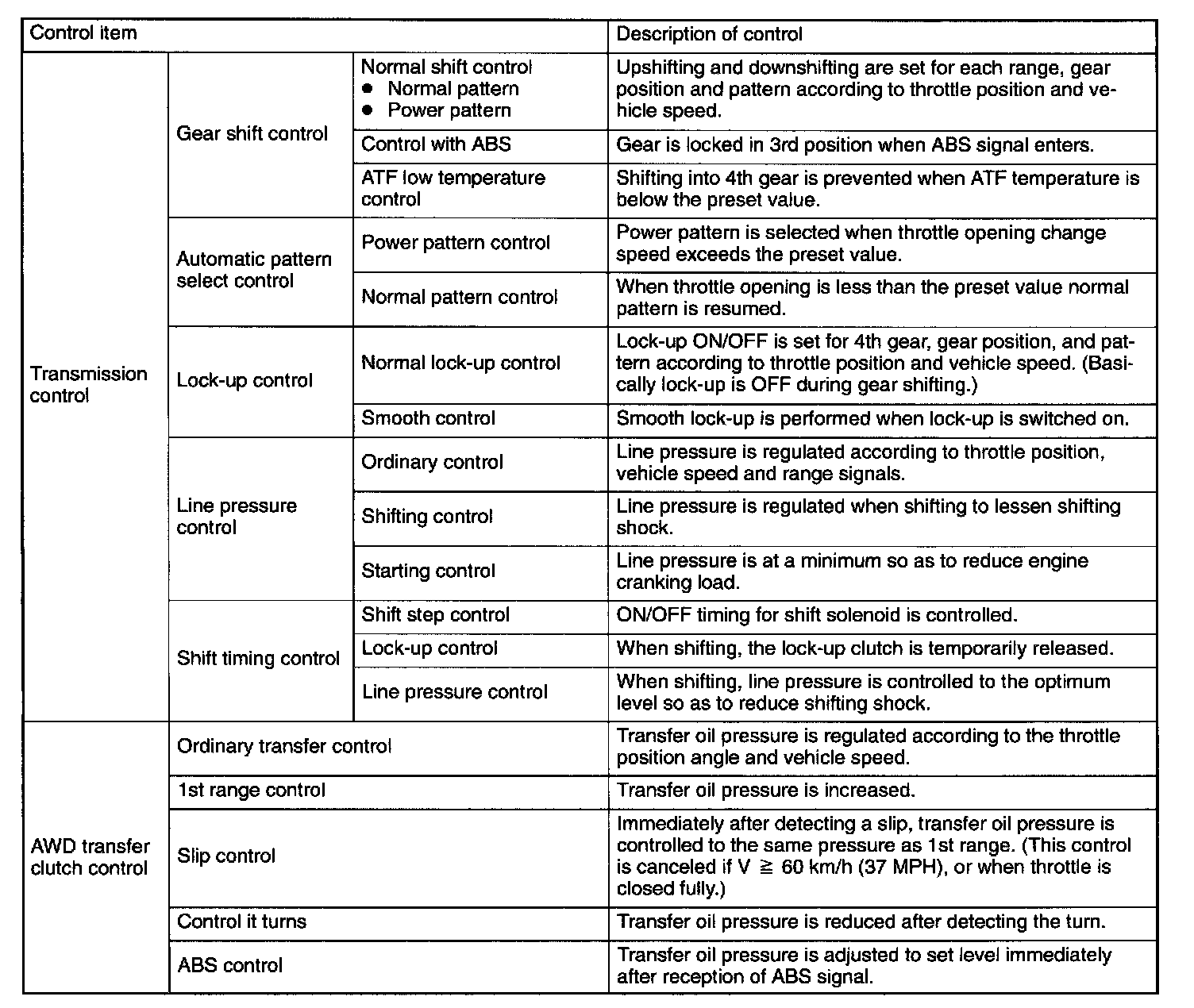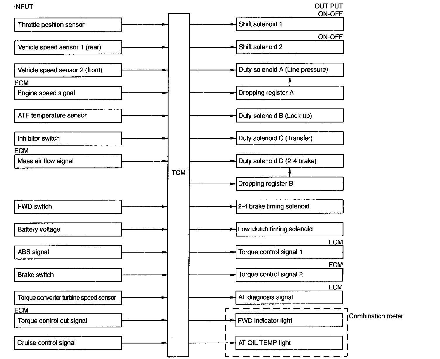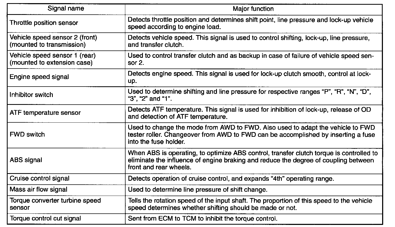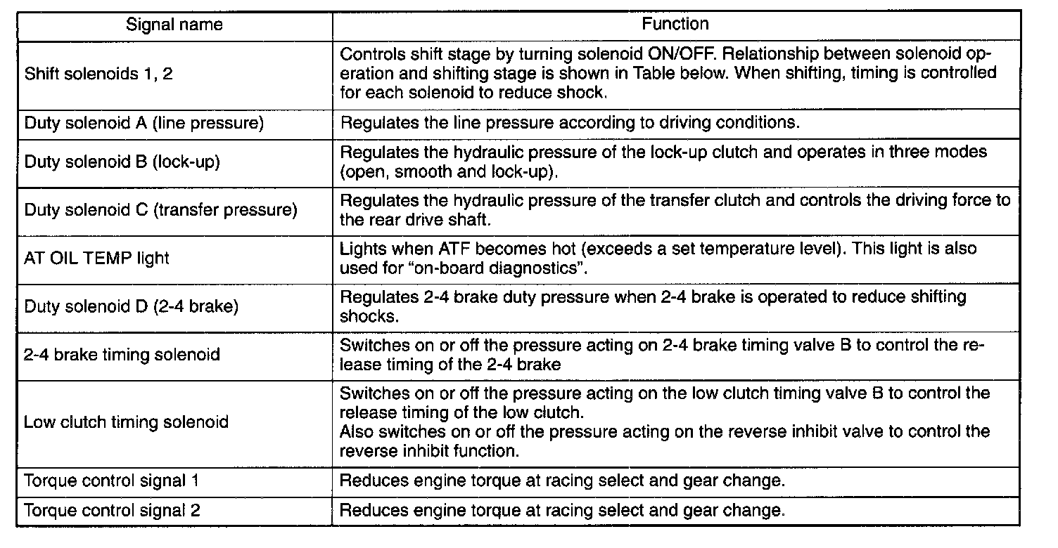 The electronic-hydraulic control system consists of various sensors and switches, a Transmission Control Module (TCM) and the hydraulic controller including solenoid valves. The system controls the transmission proper including shift control, lock-up control, timing control, reverse inhibit control, engine control, line pressure control, auto pattern select control and shift timing control. It also controls the AWD transfer clutch. In other words, the system detects various operating conditions from various input signals and sends output signals to shift solenoids 1 and 2, low clutch timing solenoid, 2-4 brake timing solenoid, duty solenoids A, B, C and D (a total of eight solenoids).