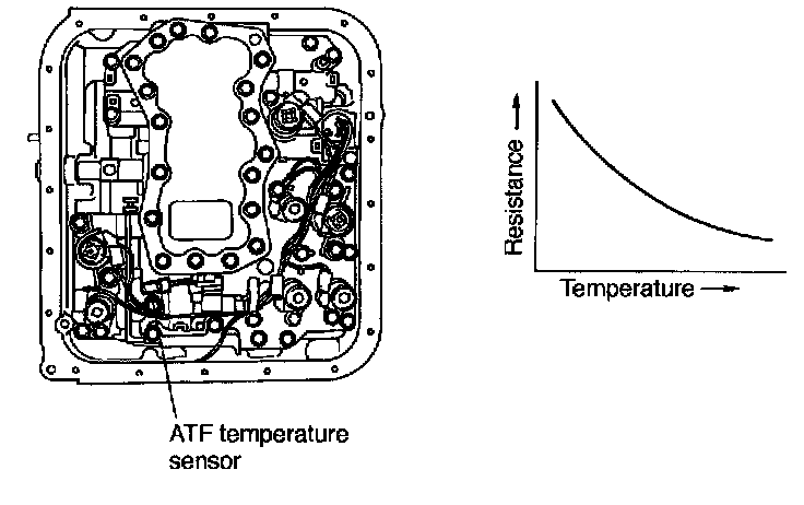 This sensor is mounted to the control valve in the transmission. It detects temperature change as an analog electrical signal. The output characteristics of the sensor are shown below.